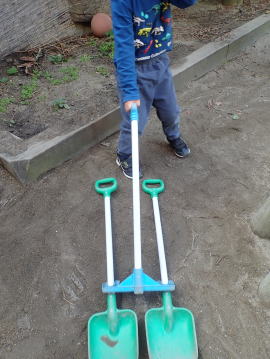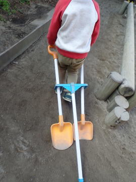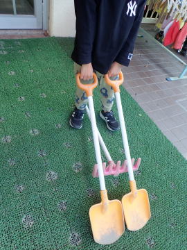ある日の3歳児ほし組、園庭のスコップなどを組み合わせて